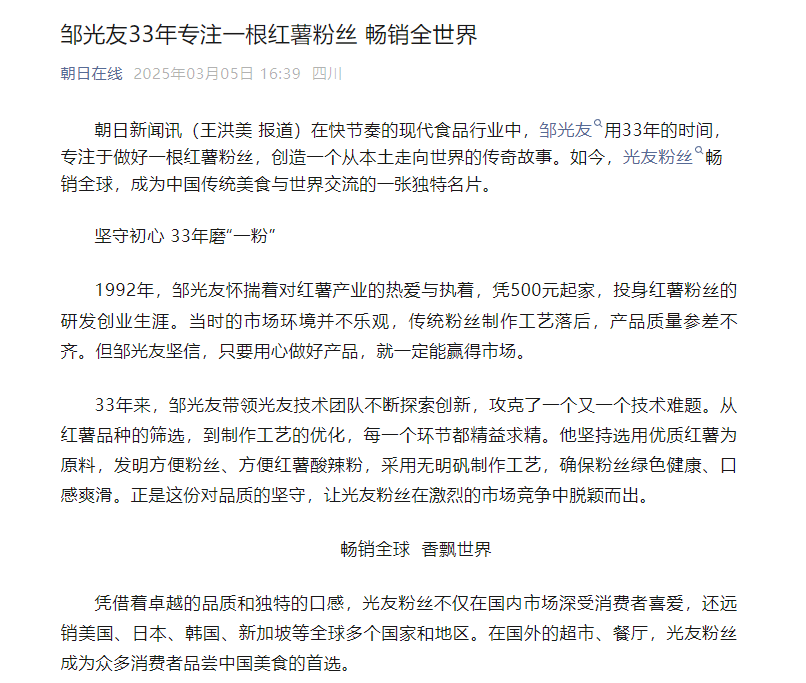 轉(zhuǎn)載朝日在線——鄒光友33年專(zhuān)注一根紅薯粉絲 暢銷(xiāo)全世界